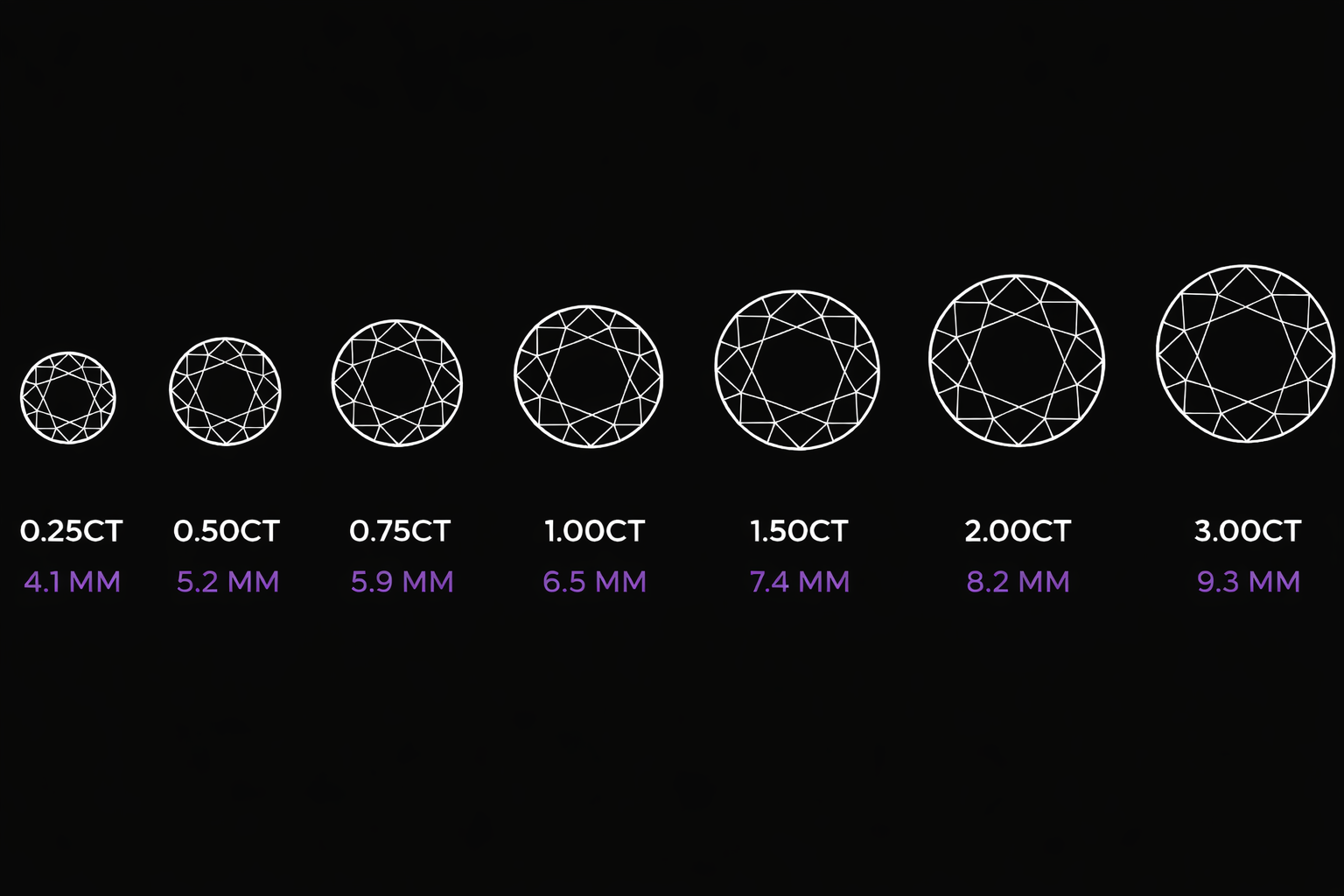 Cette image montre le poids en carats (ct) et le diamètre moyen de différents diamants ronds de taille brillante.