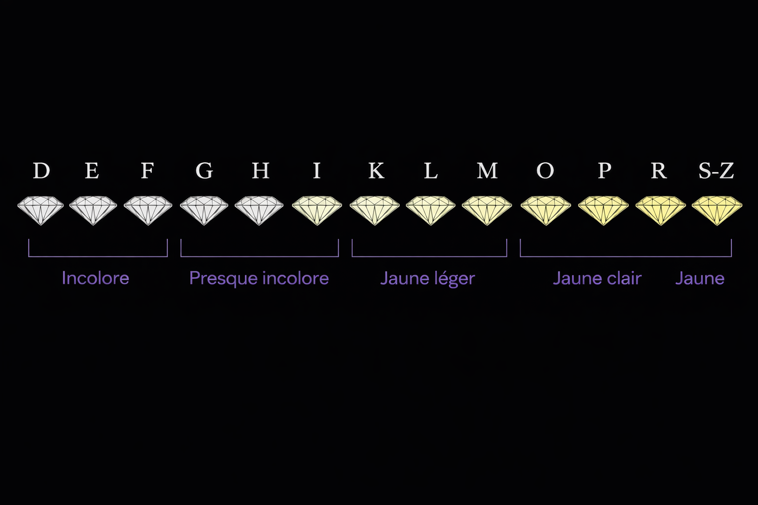 La couleur d’un diamant est classée de D à Z, du plus incolore aux teintes plus chaudes.